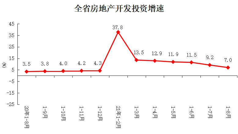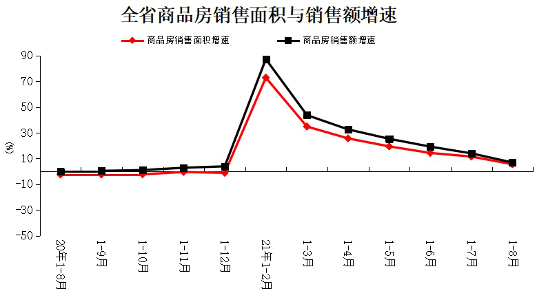1-8月份,商品房销售面积8051.69万平方米,同比增长5.5%,比2019年1-8月份增长3.0%。其中,住宅销售面积增长6.9%,办公楼销售面积下降46.6%,商业营业用房销售面积下降8.0%。商品房销售额5380.78亿元,增长6.8%,比2019年1-8月份增长6.7%。其中,住宅销售额增长8.8%,办公楼销售额下降44.6%,商业营业用房销售额下降3.3%。