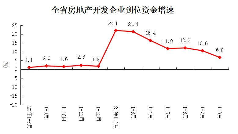 1-8月份,房地产开发企业实际到位资金5290.70亿元,同比增长6.8%,比2019年1-8月份增长8.0%。其中,国内贷款382.42亿元,与上年同期持平;自筹资金2895.88亿元,增长1.8%;定金及预收款1278.39亿元,增长11.3%;个人按揭贷款663.94亿元,增长24.2%。