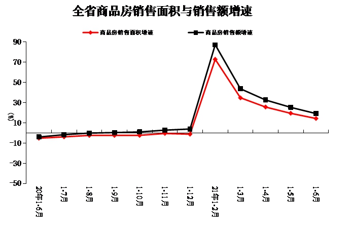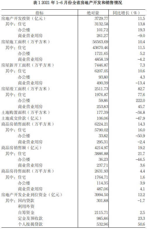 1-6月份,商品房销售面积6224.21万平方米,同比增长14.3%,比2019年1-6月份增长8.4%。其中,住宅销售面积增长16.0%,办公楼销售面积下降50.9%,商业营业用房销售面积下降2.4%。商品房销售额4214.97亿元,增长19.2%,比2019年1-6月份增长14.4%。其中,住宅销售额增长21.7%,办公楼销售额下降44.5%,商业营业用房销售额增长3.6%。