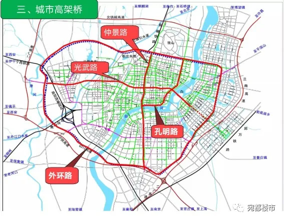 主城区规划了三条高架路:孔明路、仲景路、光武路。