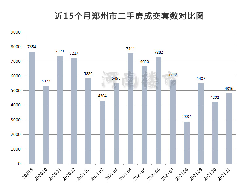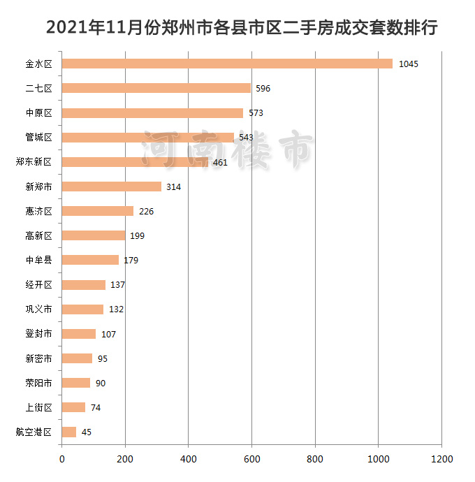在2021年11月份成交的4816套二手房中,其中金水区以1045套的成交量位居全市各县市区之首,长期保持成交量第一;二七区以596套位居第二,中原区以573套位居第三,管城区、郑东新区分列第四、五位。航空港区、上街区、荥阳市分列后三位。