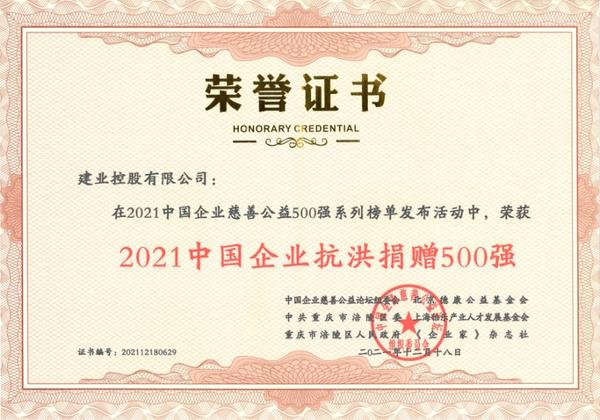 建业集团荣获“2021中国企业慈善公益500强”和“2021中国企业抗洪捐赠500强”,建业集团董事长胡葆森荣获“2021中国慈善企业家”荣誉称号。