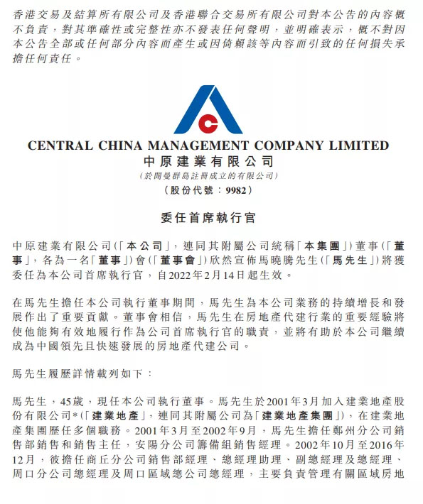 此外,建业集团旗下代建公司“中原建业”(09982.HK)当日也发布委任首席执行官公告,马晓腾获委任为公司首席执行官。