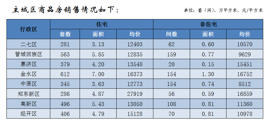 郑州全市商品房销售8111套(间),销售面积92.85万平方米,销售均价11164元/平方米;其中商品住宅销售6719套,销售面积79.02万平方米,销售均价11551元/平方米。非住宅销售1392套(间),非住宅销售面积13.83万平方米,非住宅销售均价为8954元/平方米。