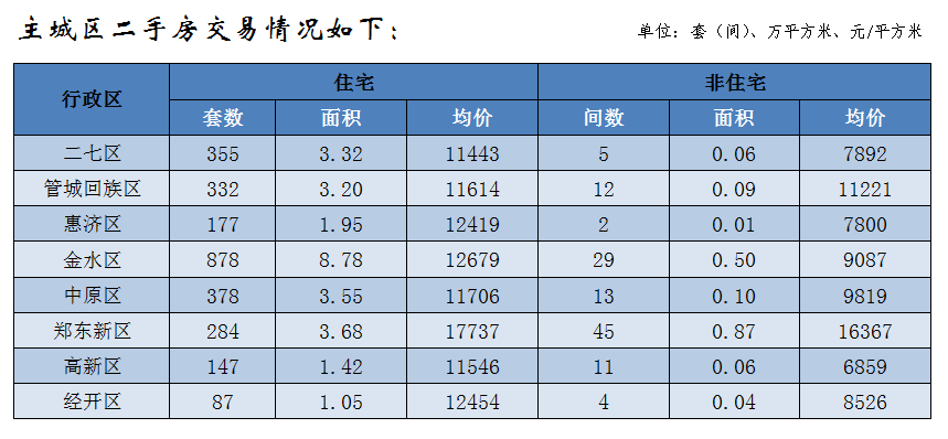 郑州全市二手房共成交3716套(间),成交面积39.77万平方米,成交均价10925元/平方米;其中住宅二手房共成交3564套,成交面积37.65万平方米,成交均价10905元/平方米。(备注:二手房均价是以评估指导价为计算依据)