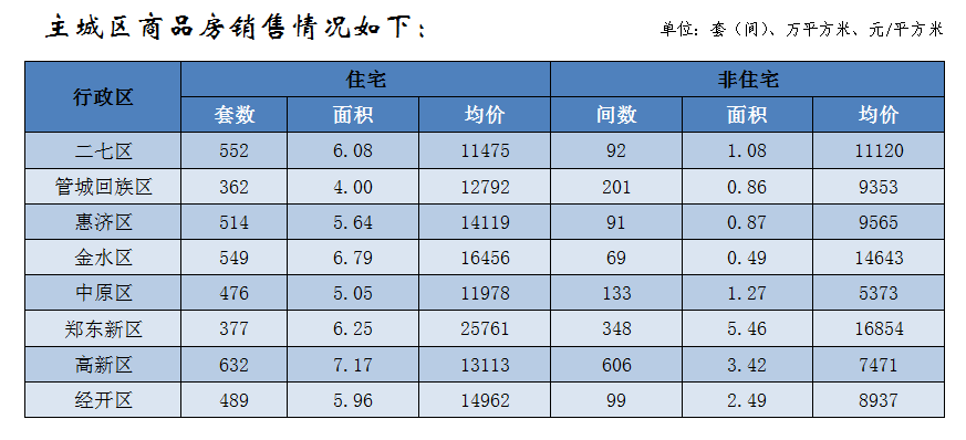 郑州全市商品房销售8802套(间),销售面积103.64万平方米,销售均价11472元/平方米;其中商品住宅销售6898套,销售面积81.81万平方米,销售均价11922元/平方米。非住宅销售1904套(间),非住宅销售面积21.83万平方米,非住宅销售均价为9784元/平方米。