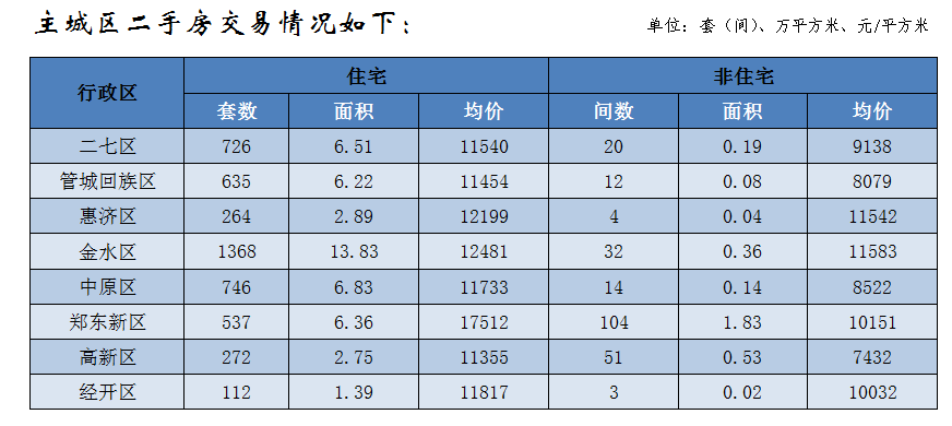 郑州全市二手房共成交6293套(间),成交面积66.04万平方米,成交均价10840元/平方米;其中住宅二手房共成交6011套,成交面积62.37万平方米,成交均价10951元/平方米。(备注:二手房均价是以评估指导价为计算依据)
