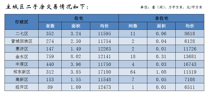 郑州全市二手房共成交3478套(间),成交面积37.25万平方米,成交均价10779元/平方米;其中住宅二手房共成交3356套,成交面积35.41万平方米,成交均价10753元/平方米。(备注:二手房均价是以评估指导价为计算依据)