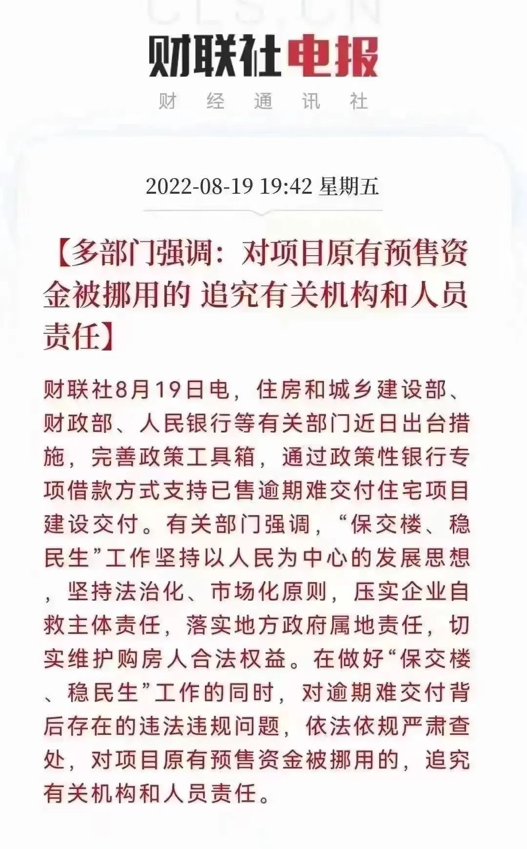 相关部门强调,“保交楼、稳民生”工作,要压实企业自救主体责任,落实地方政府属地责任,切实维护购房人合法权益。在做好“保交楼、稳民生”工作的同时,对逾期难交付背后存在的违法违规问题,依法依规严肃查处。对项目原有预售资金被挪用的,追究有关机构和人员责任。