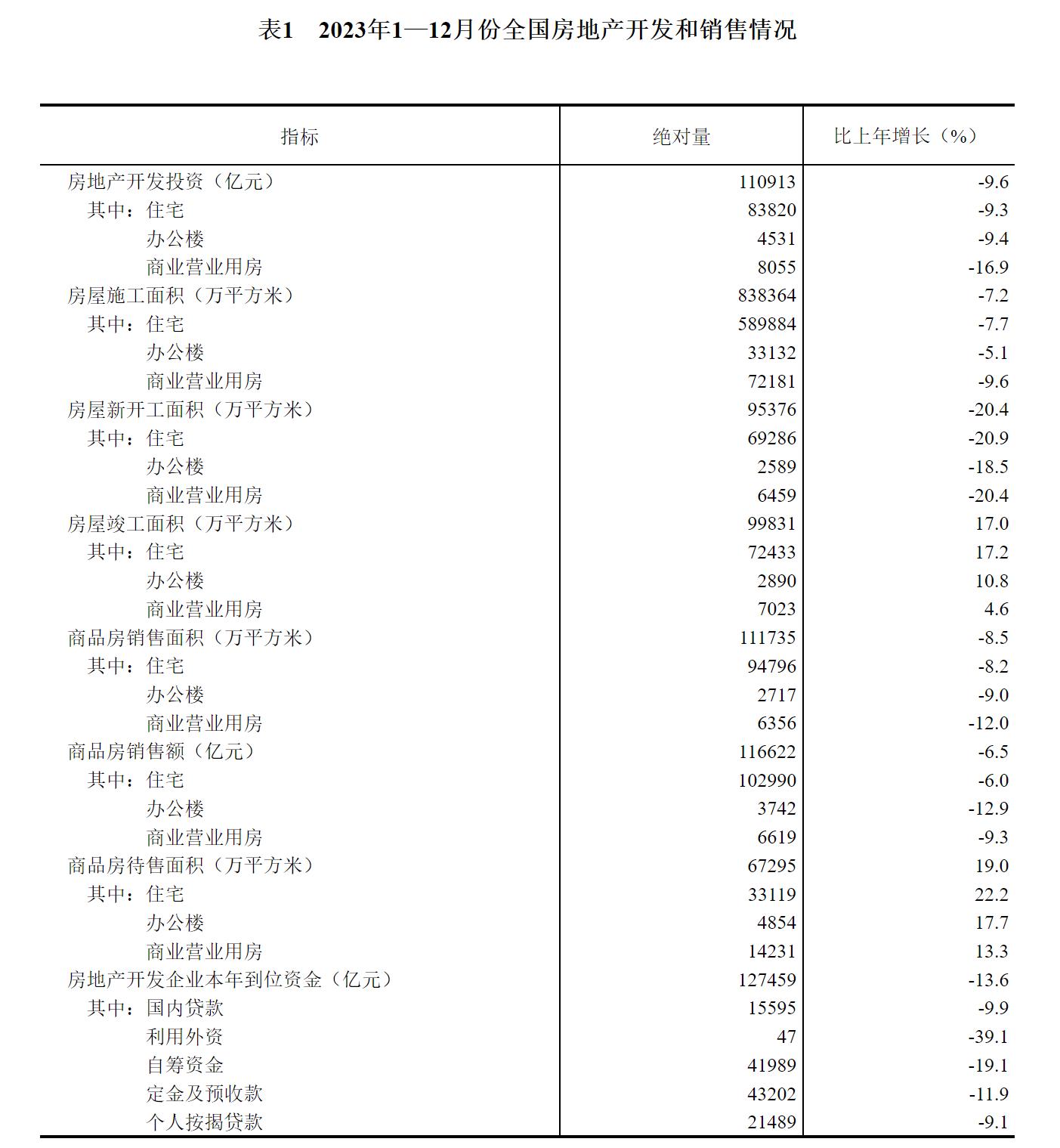 2023年,商品房销售面积111735万平方米,比上年下降8.5%,其中住宅销售面积下降8.2%。商品房销售额116622亿元,下降6.5%,其中住宅销售额下降6.0%。